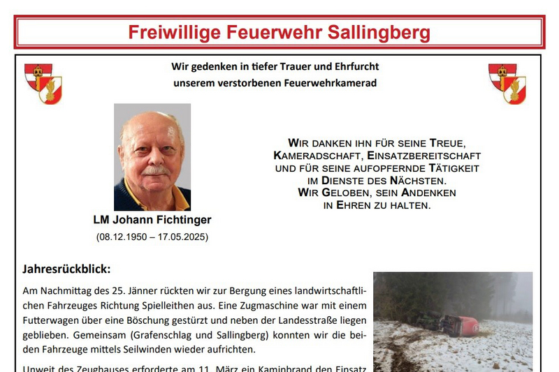Die Freiwillige Feuerwehr Sallingberg gibt in tiefer Trauer bekannt, dass EHBM Johann Höld am 25. Dezember 2025 von uns gegangen ist.